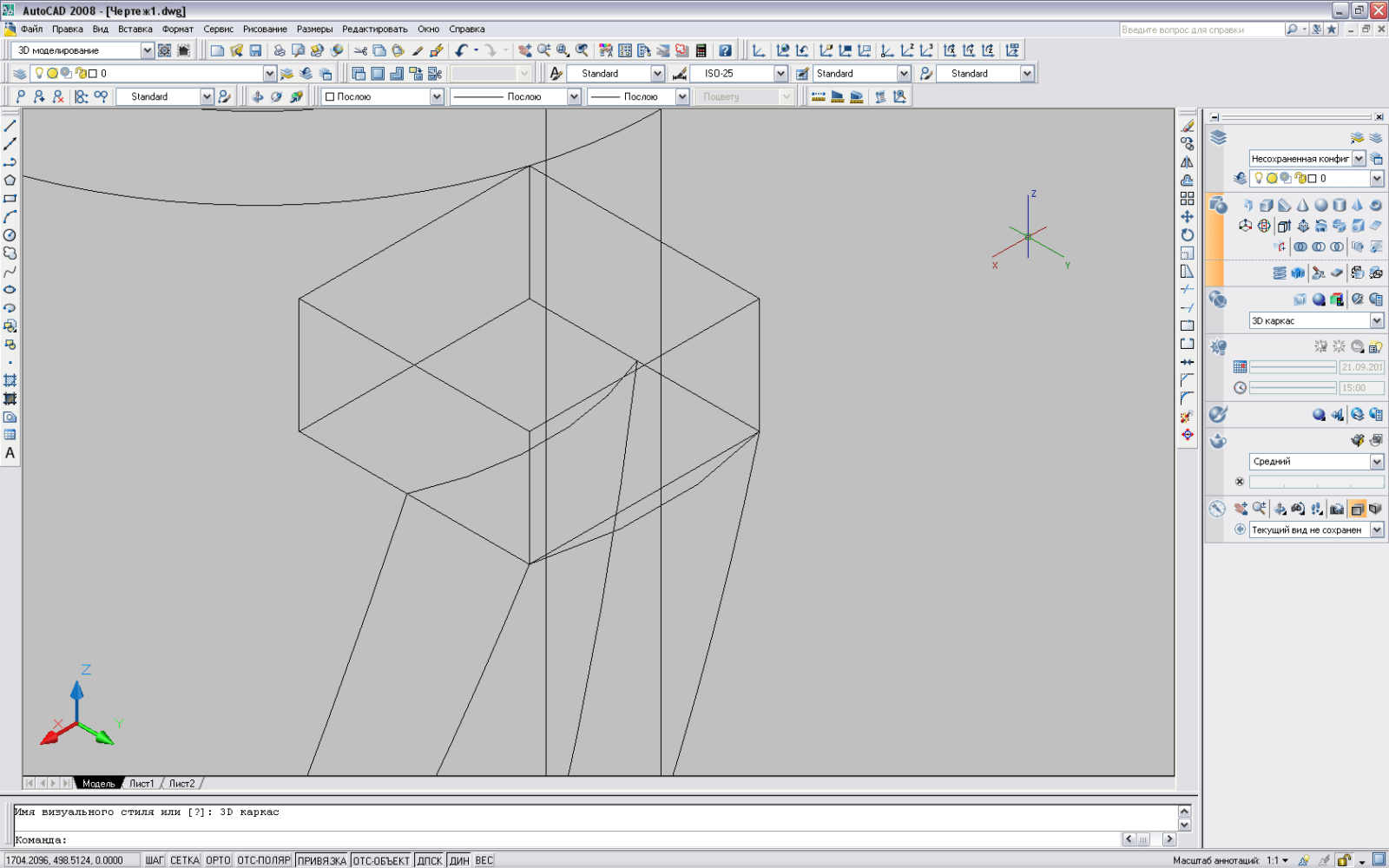 Теперь стоит задача выполнить еще два паза, сверху и снизу, являющимися продолжением имеющегося спирального отверстия. Эти пазы необходимы для горизонтального хода рабочего элемента при поджатии детали и минимального хода при движении штока в верхнем положении. И так. Строим два ящика размерами: Ширина 8мм, длина 10 мм.. и высота: у верхнего 4 мм, у нижнего 6 мм. Переедем вначале в 3D каркас, и выбрав одну из углов на плоской площадке строим командой “Ящик” параллелепипед.