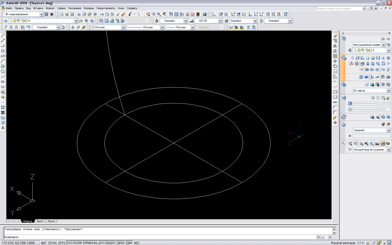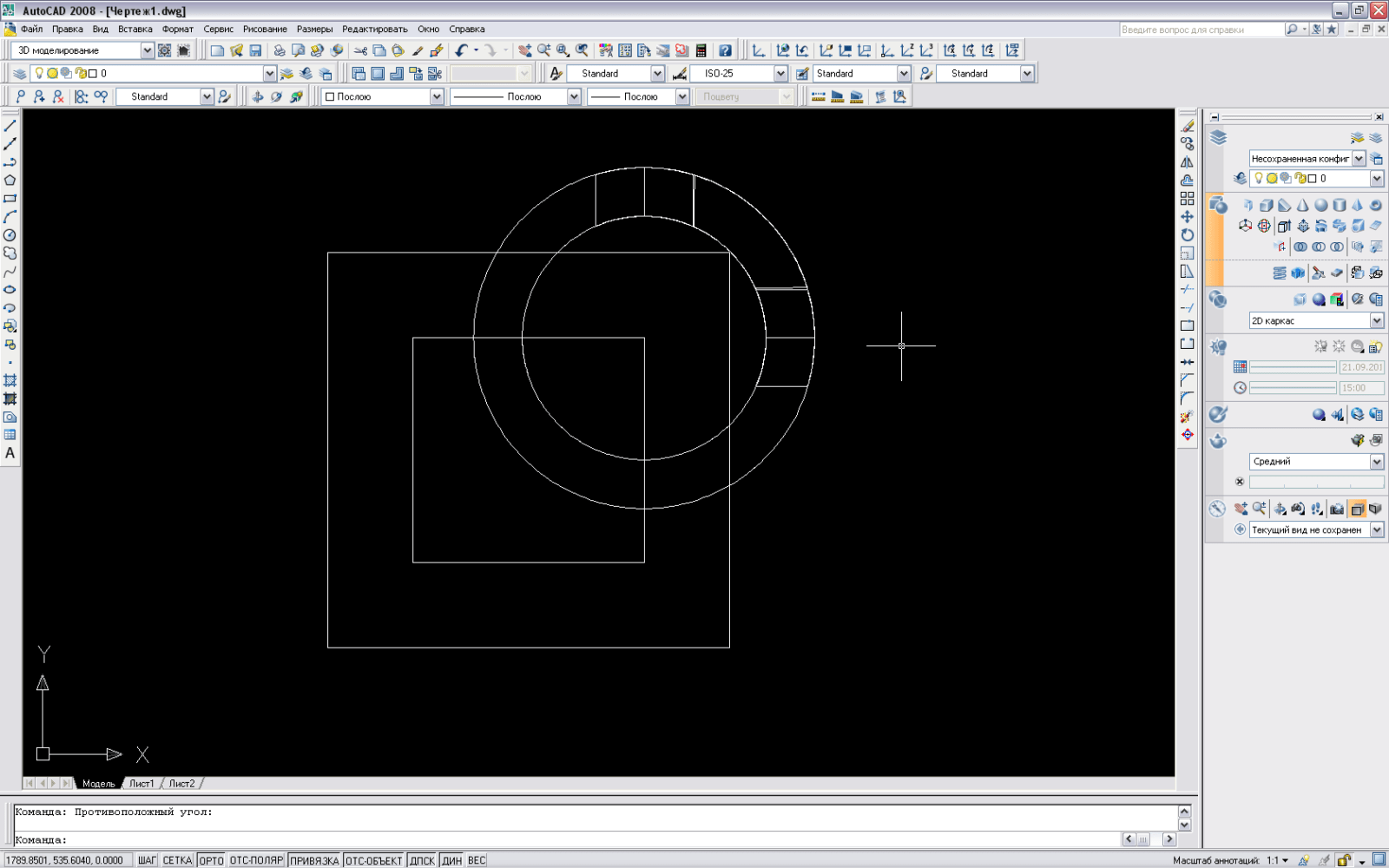 Войдем в 2D каркас установим вид сверху и изобразим прямоугольник начальной точкой построения выбрав центр окружностей стакана. Затем командой “Подобие” из вкладки “Редактирование” сдвинем на 7 мм и получим необходимый прямоугольник для выдавливания.