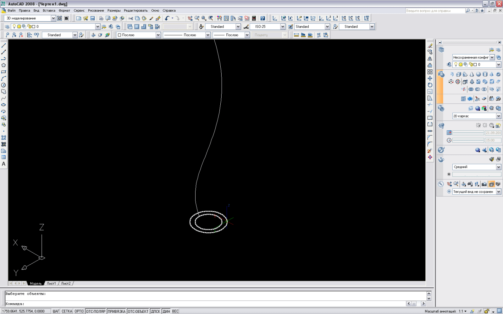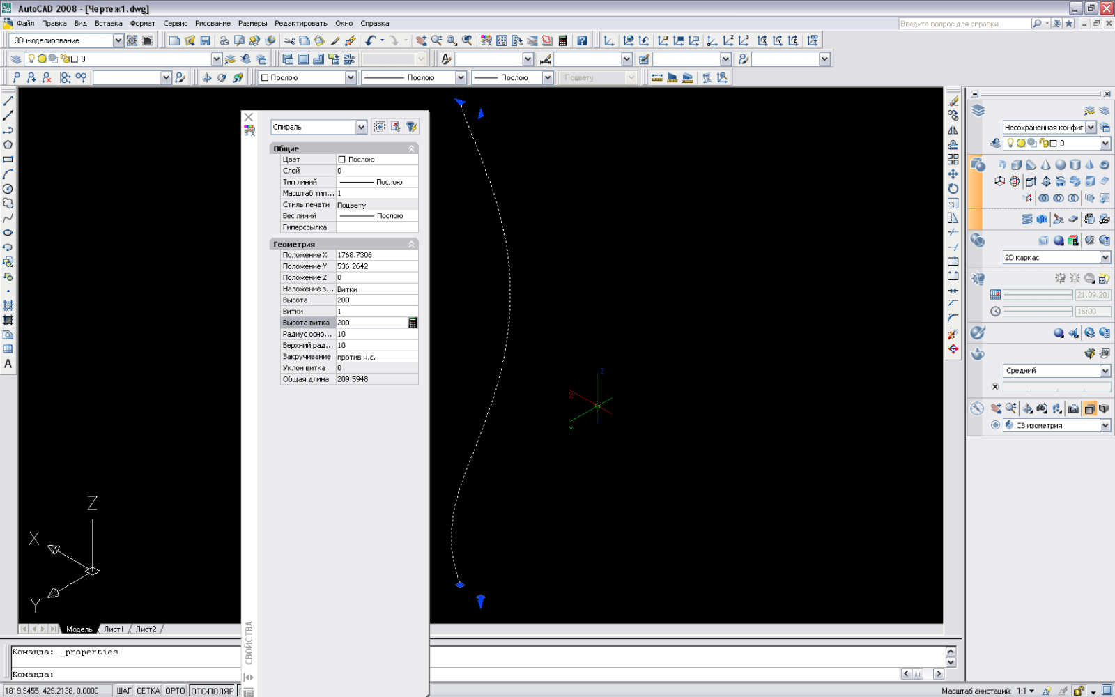 По умолчанию у нас установлено 3 витка. Войдя в свойства нашей спирали, установим количество витков равным 1, Установив при этом вид “СЗ-изометрия”.