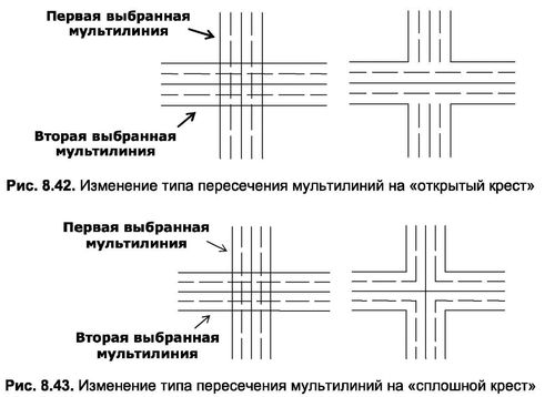 «Открытый крест» – в пересечении удаляются все линии первой выбранной мультилинии и крайние линии второй (рис. 8.42).