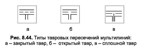 «Закрытый тавр» – отсекается продолжение первой выбранной мультилинии со стороны, противоположной точке выбора; в пересечении вырезается содержимое первой мультилинии, а содержимое второй остается без изменений (рис. 8.45).