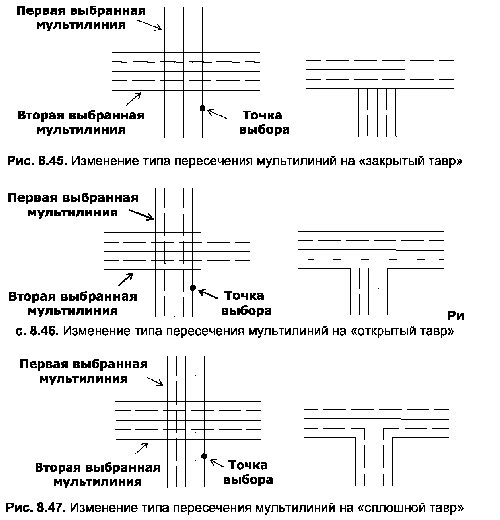 Примечание. При изменении типа таврового пересечения также большое значение имеет то, какая из линий выбирается первой и где находится точка выбора (точка выбора должна находиться с той стороны, где мультилиния будет иметь продолжение).
