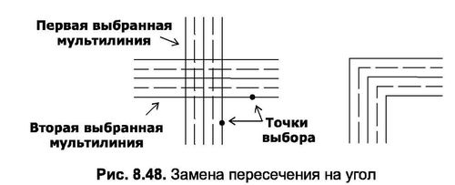 «Сплошной тавр» – отсекается продолжение первой выбранной мультилинии со стороны, противоположной точке выбора, а в пересечении попарно соединяются все внутренние и удаляется крайняя линия второй мультилинии (рис. 8.47).