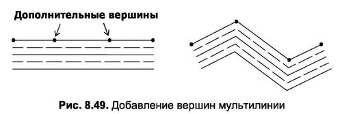 Для вставки новой вершины используется пиктограмма , расположенная в окне Multiline Edit Tools (см. рис. 8.39). После вызова этой опции в ответ на вопрос Select mline следует щелкнуть левой кнопки мыши в той точке мультилинии, где нужно добавить вершину. Причем независимо от того, в каком месте по ширине мультилинии была указана эта точка, новая вершина добавляется на крайней левой линии (наблюдатель расположен вдоль продольной оси мультилинии лицом к конечной точке). Пример мультилинии с двумя добавленными вершинами приведен на рис. 8.49.